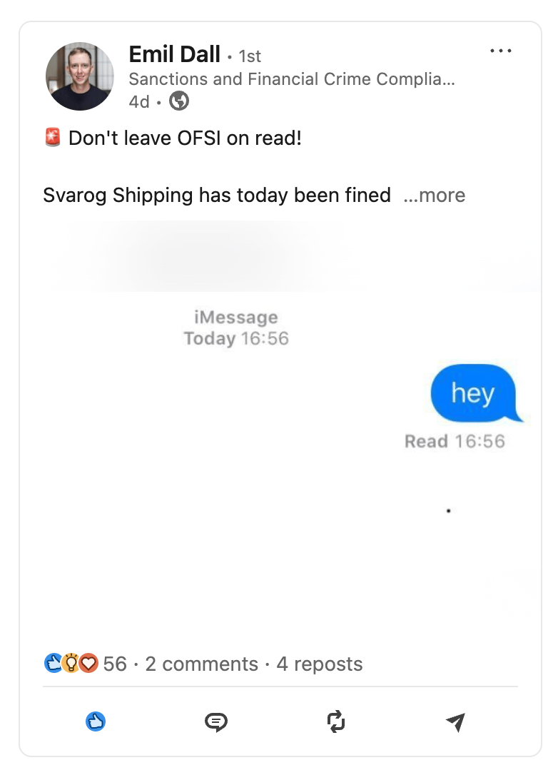 Don’t get me wrong, I think there’s a a place for great, original responses on a LinkedIn feed (see below Emil Dall’s brilliant post last week about the OFSI Svarog fine).